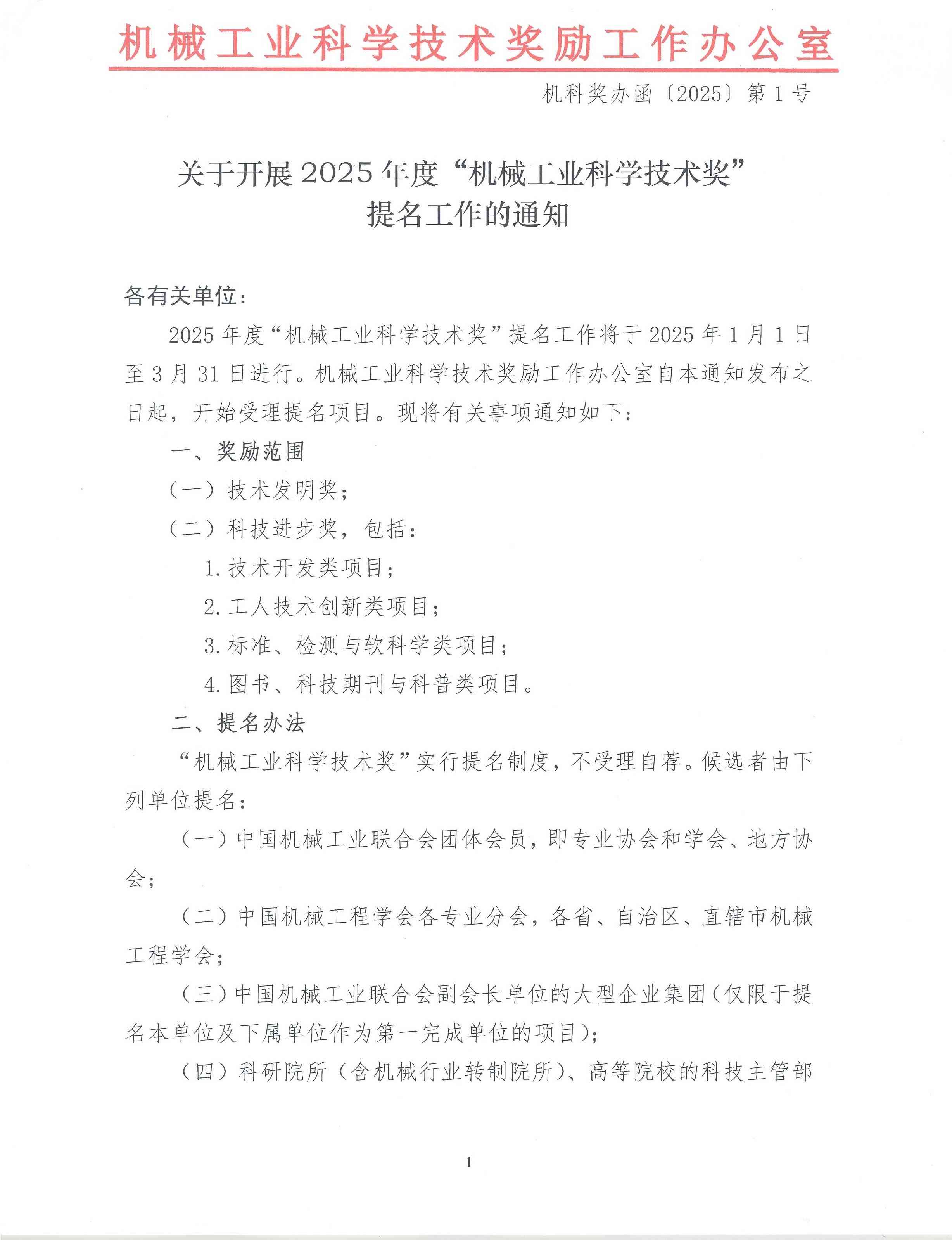 附件1: 关于开展2025年度机械工业科学技术奖提名工作的通知