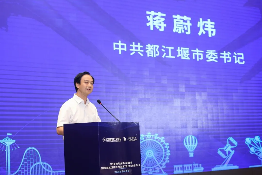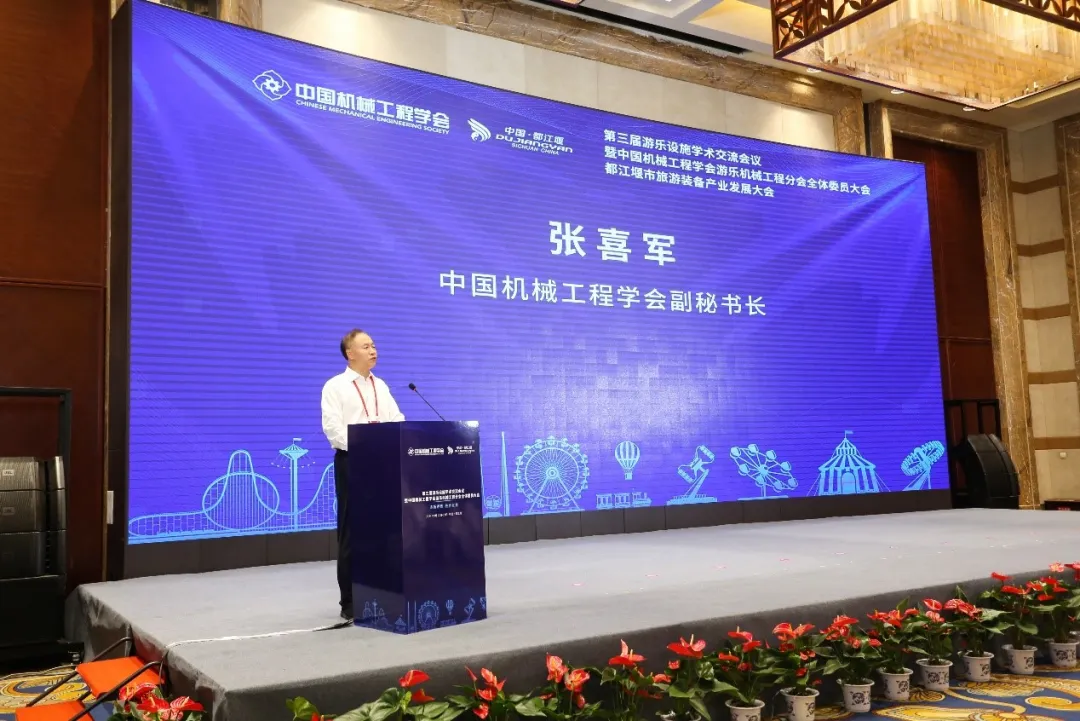 会议由中国机械工程学会游乐机械工程分会主任委员、华强方特文化科技集团创始人戎志刚主持。中共都江堰市委书记蒋蔚炜,中国机械工程学会副秘书长张喜军,中国机械工程学会常务理事、原中国特检院副院长沈功田,中国游艺机游乐园协会秘书长许萍,中国索道协会秘书长黄鹏智,四川省机械工程学会副理事长王健分别致辞。张喜军副秘书长充分肯定了游乐分会在组织活动、标准研制、智库建设方面等取得的工作成绩,同时强调了要紧跟国家政策导向,把握发展机遇,尤其是通过研发高端装备、加强数字化技术赋能等手段,推动旅游装备技术创新,促进产业链的协同和优化,为促进地方经济和文化旅游产业的繁荣做出积极贡献。