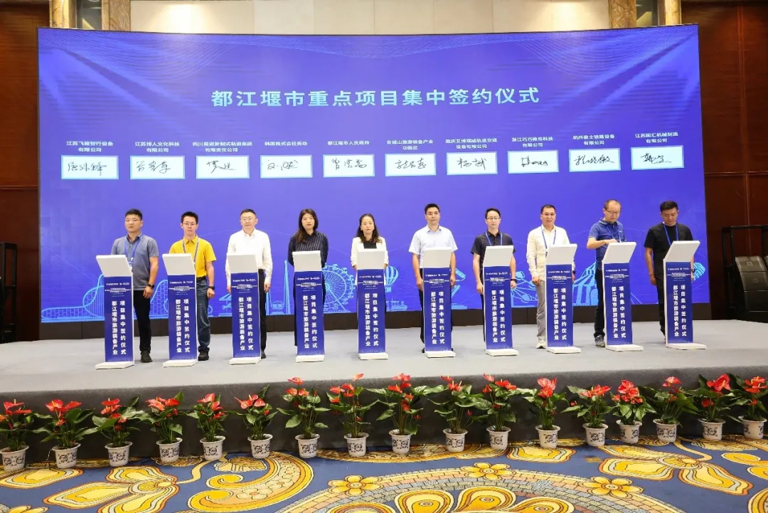 开幕式上,还完成了都江堰市旅游装备产业推介和集中签约。韩国株式会社美动、四川蜀道新制式轨道交通集团有限责任公司、江苏飞梭智行设备有限公司、江苏博人文化科技有限公司、重庆艾博瑞威轨道交通设备公司、浙江巧巧教育科技有限公司、杭州俊士铁路设备有限公司、江苏国汇机械制造有限公司8家企业与都江堰市完成了重点项目的签约,后续将围绕旅游装备生产制造和场景建设方面开展深入合作。