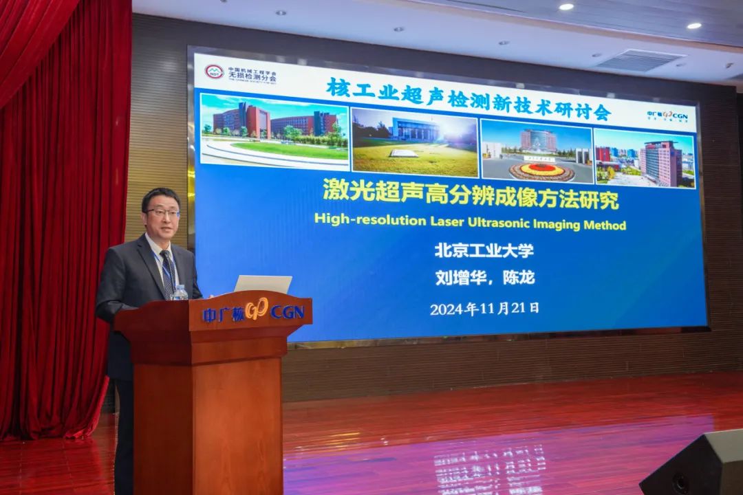 中国机械工程学会无损检测分会超声检测大会主席、北京工业大学刘增华教授围绕激光超声技术,做了题为“激光超声高分辨成像方法研究”专题报告,从核电微缺陷检测问题、多模态效应与噪声抑制、合成孔径聚焦成像与图像融合、全聚焦成像与数据稀疏四个方面做了介绍。