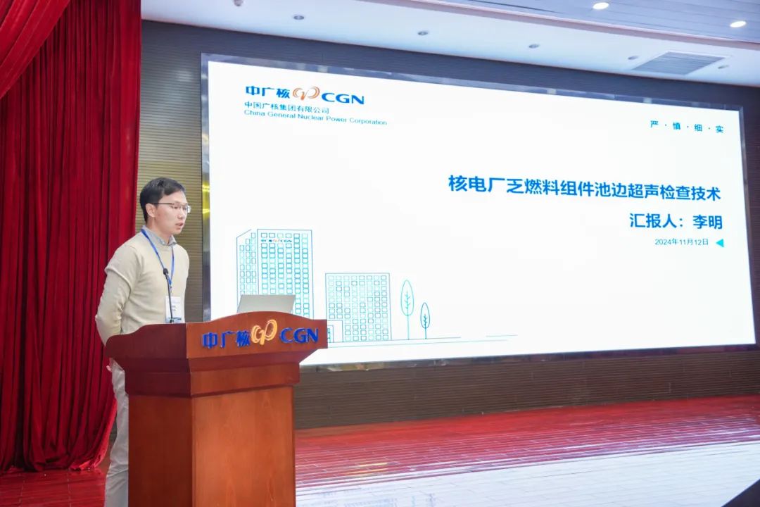 随后,中广核检测技术有限公司、中国广核集团无损检测首席专家李明先生团队成员汤建帮博士,作了“核电厂乏燃料组件池边超声检查技术”的专题报告,分享了反应堆控制棒束组件超薄壁水下超声检测技术,以及燃料组件破损定位检查与组件变形等技术与装备的研究进展和核电应用情况。