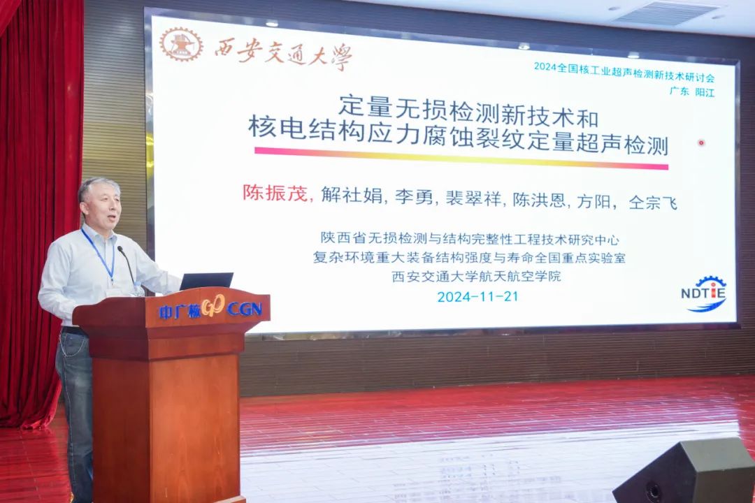 下午会议报告继续进行。中国西部质量科学技术研究院副院长、西安交通大学陈振茂教授做了题为“定量无损检测新技术和核电结构应力腐蚀裂纹定量超声检测”专题报告,详细介绍了柔性电磁超声传感器、新型阵列检测柔性电磁超声相控阵检测仪、核电聚变堆结构体积检测技术、高温堆螺旋换热管导波检测技术等。