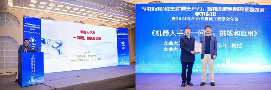 机器人分会12月21日在南昌大学国际学术交流中心召开了“2024年智能机器人协同创新学术论坛”,由江西省机械工程学会、上海市机器人学会、智能机器人江西省重点实验室、上海市大型构件智能制造机器人技术协同创新中心共同主办,南昌大学先进制造学院、机器人研究所及上海工程技术大学机器人研究所承办,2024“科创中国”关键基础装备科技服务团(江西)提供指导。东南大学宋爱国教授、湖南大学张辉教授、加拿大工程院院士刘小平教授、上海交通大学曹其新教授、上海工程技术大学高延峰教授、南昌大学熊鹏文教授、江西省机械工程学会李立德教授以及江铃汽车股份有限公司许兰锋副总裁、安徽爱观视觉科技有限公司张晓林、上海新时达电气股份有限公司梁锐围绕智能机器人协同创新展开主题演讲,与会代表还围绕相关研究方面进行了深入的交流与探讨。
