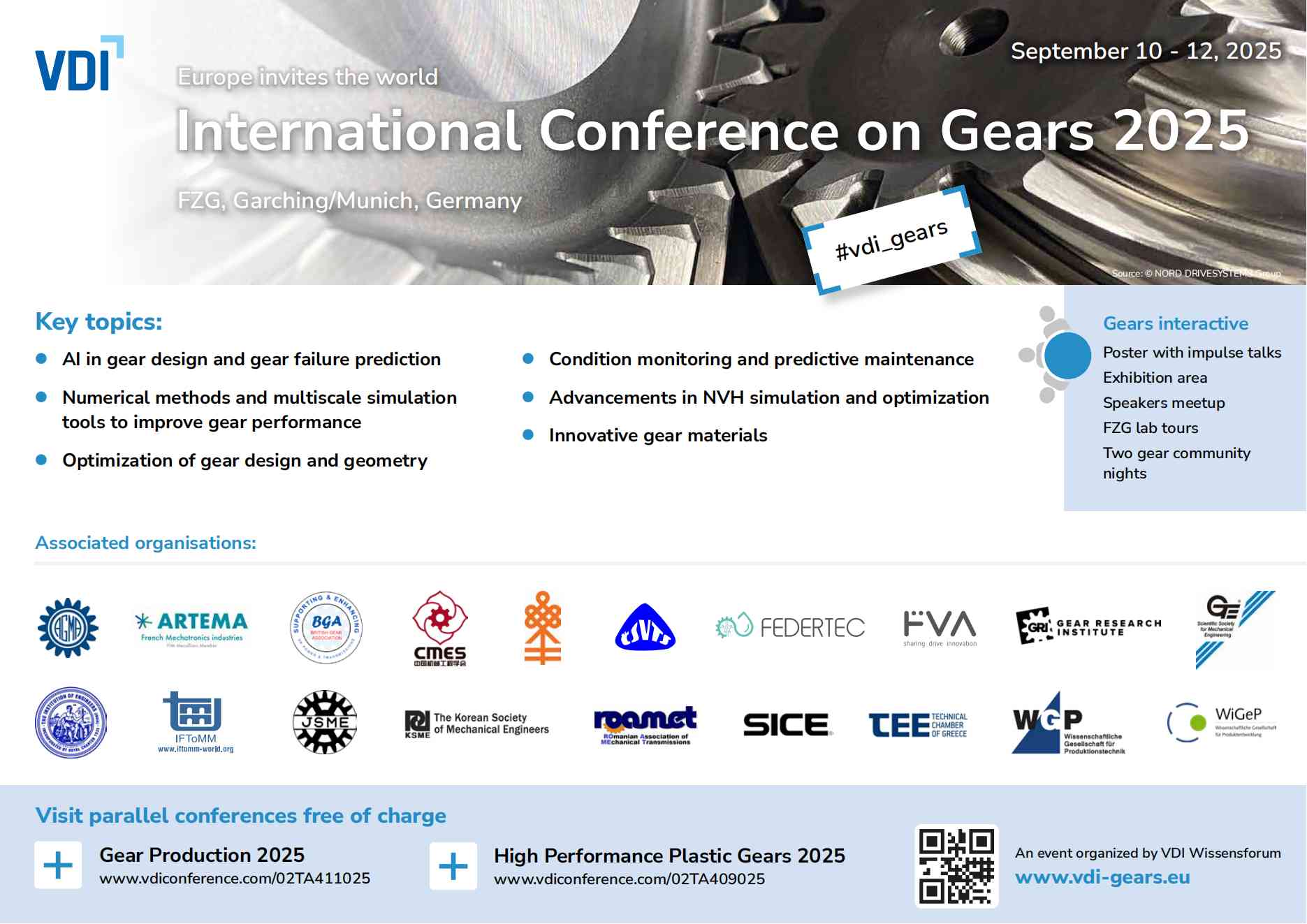 2025年国际齿轮大会将于2025年9月10-12日在德国慕尼黑举行,会议由德国工程师协会(VDI)主办、中国机械工程学会等组织协办。我会会员可享受注册优惠,欢迎感兴趣的会员积极参与。