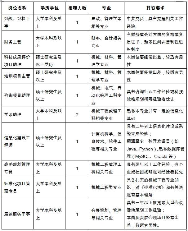 本次计划招聘11人,主要从事党建、财务、学术、团体标准等相关工作,具体岗位及资格条件如下。本次招聘岗位学历学位要求为应聘人员获得的最高学历学位。