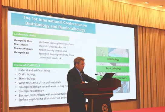 2024年9月11-13日,第一届生物与仿生摩擦学国际会议(International Conference on Biotribology and Bionic-tribology, ICoBB)在四川成都成功举办。此次会议由中国机械工程学会摩擦学分会主办,西南交通大学、《Biosurface and Biotribology》期刊承办,会议由西南交通大学周仲荣教授、帝国理工Marc Masen教授、美国拉什大学医学中心Wimmer教授和西南交通大学/利兹大学靳忠民教授联席主持本次会议,中国机械工程学会摩擦学分会主任委员周仲荣教授代表分会致开幕词。