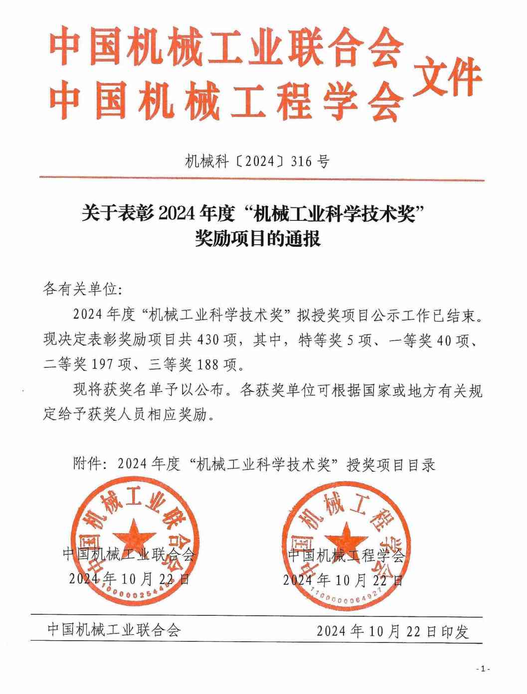 2024年12月3日,2024年度机械工业科学技术奖在重庆召开的2024年装备制造业发展大会上举行了颁奖仪式。中国机械工程学会荣誉理事长李培根院士,中国机械工程学会理事长林忠钦院士,中国机械工程学会副理事长、国际智能制造联盟主席杨华勇院士,中国机械工程学会常务理事、重庆大学校长王树新院士,中国机械工程学会原副理事长、中国机械工业联合会副会长、机械工业科学技术奖管理委员会副主任陆大明,中国机械工程学会秘书长张喜军等领导出席颁奖仪式。