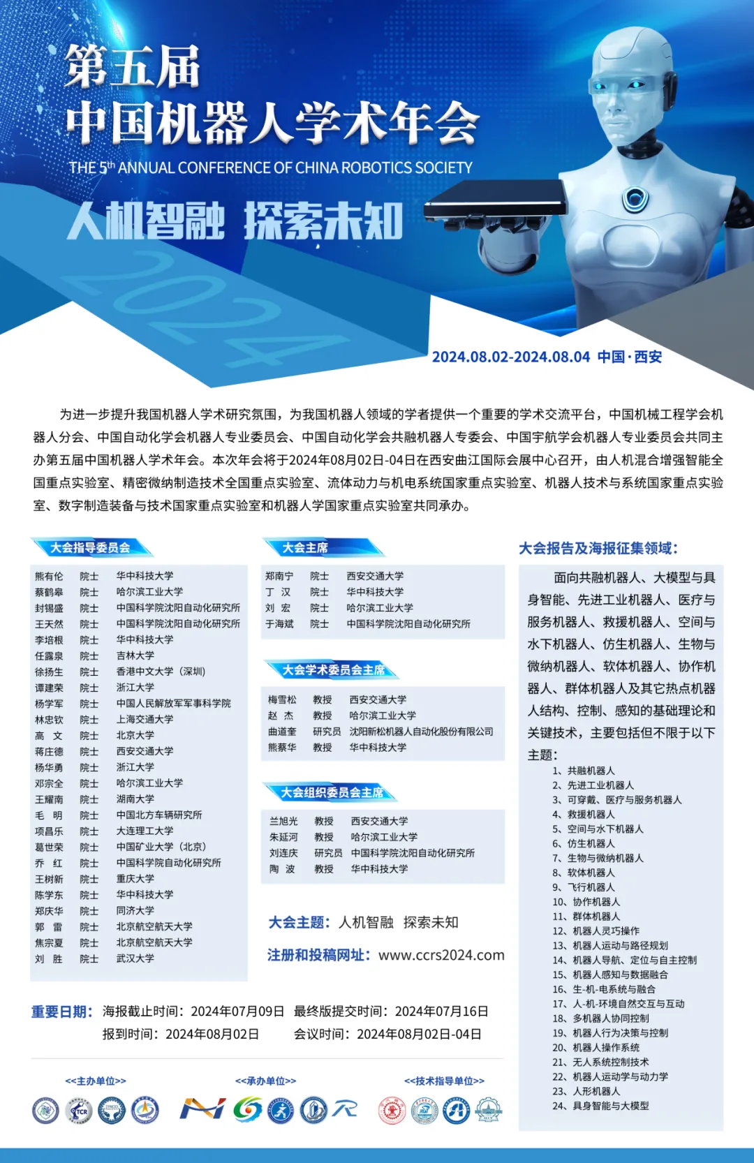 中国机器人学术年会是我国机器人领域的学术盛会、中国机械工程学会2023年度最具影响力的学术活动。第五届中国机器人学术年会将于2024年8月2日-4日在西安曲江国际会议中心举办,本次会议由中国机械工程学会机器人分会、中国自动化学会机器人专业委员会、中国自动化学会共融机器人专业委员会、中国宇航学会机器人专业委员会、中国人工智能学会智能机器人专业委员会共同主办。