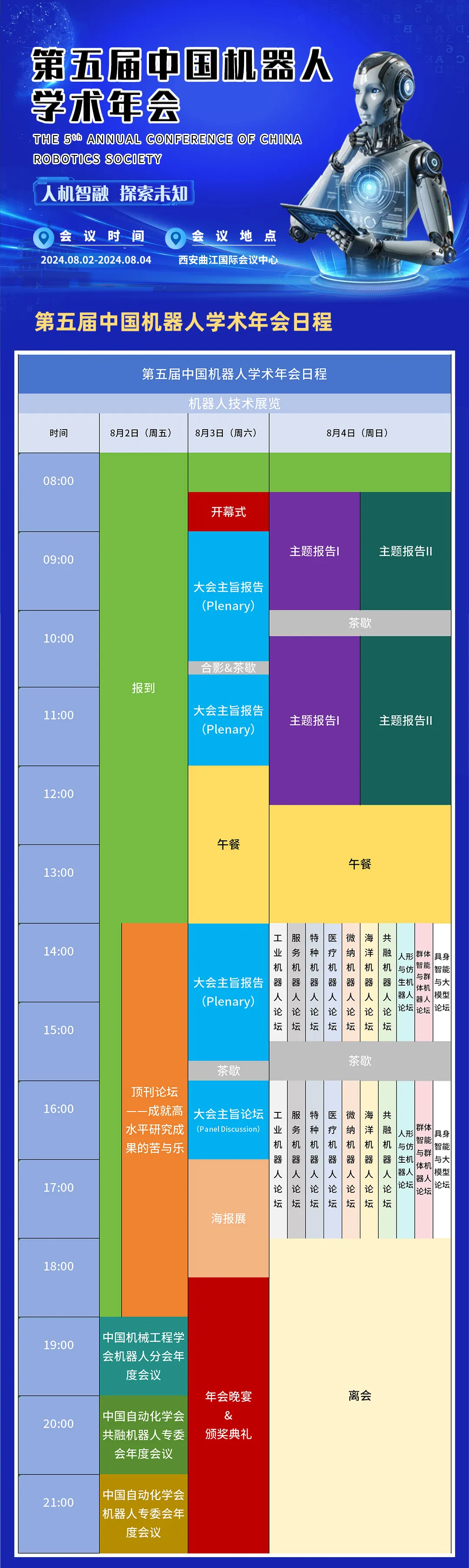 本届会议以“人机智融、探索未知”为主题,邀请我国机器人相关学科30余位院士、200余位行业学界、企业界专家,为大家奉献8个主旨报告、14个主题报告、80余个分论坛特邀报告以及专家论坛、机器人技术展览、学术海报展览等活动。欢迎国内外机器人领域相关学者荟聚古城、共襄盛会!