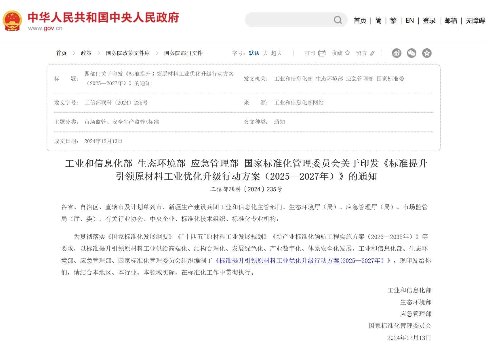 工业和信息化部 生态环境部 应急管理部 国家标准化管理委员会关于印发《标准提升引领原材料工业优化升级行动方案(2025—2027年)》的通知